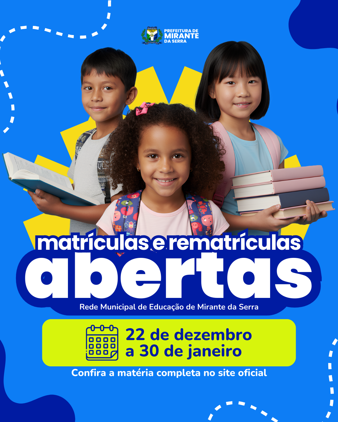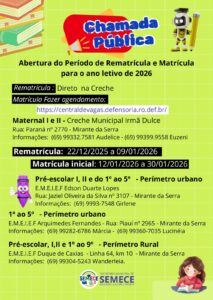 SEMECE CHAMADA PÚBLICA, ABERTURA DO PERÍODO DE REMATRÍCULA E MATÍCULA PARA O ANO LETIVO DE 2026 Leia Mais > 10 de dezembro de 2025 10:27