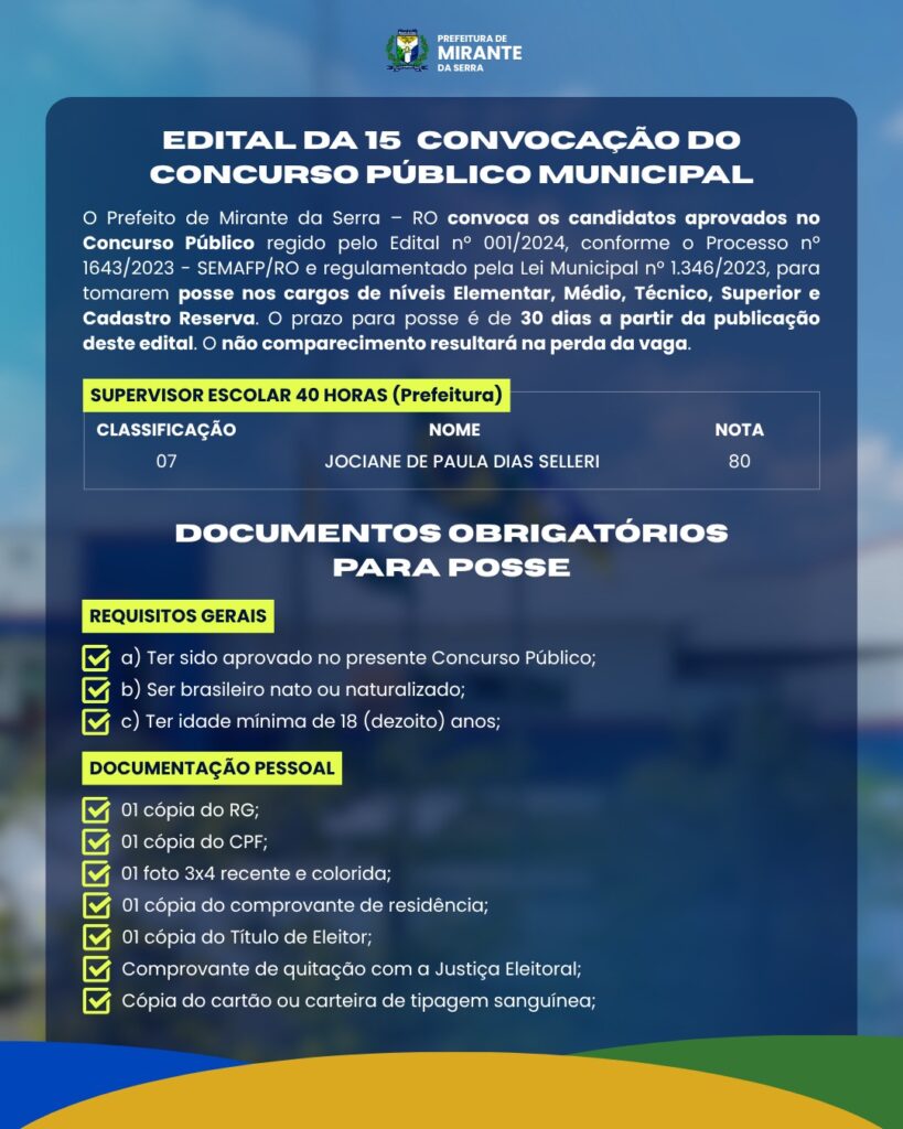 O Prefeito do Município de Mirante da Serra – RO, no uso das atribuições legais que lhes foram conferidas, em razão de aprovação no CONCURSO PÚBLICO, REGULAMENTADA PELA LEI MUNICIPAL 1.346/2023 constando nos autos do PROCESSO DE Nº 1643/2023- SEMAFP/RO, objetivando o provimento de cargos públicos, de Níveis Elementar, Médio, Médio Técnico, Superior e cadastro reserva, regida pelo Edital nº15/2025, CONVOCA, os candidatos relacionados abaixo, para tomarem posse no prazo de 30 (trinta) dias a partir da publicação deste Edital, sob pena de perda de vaga.