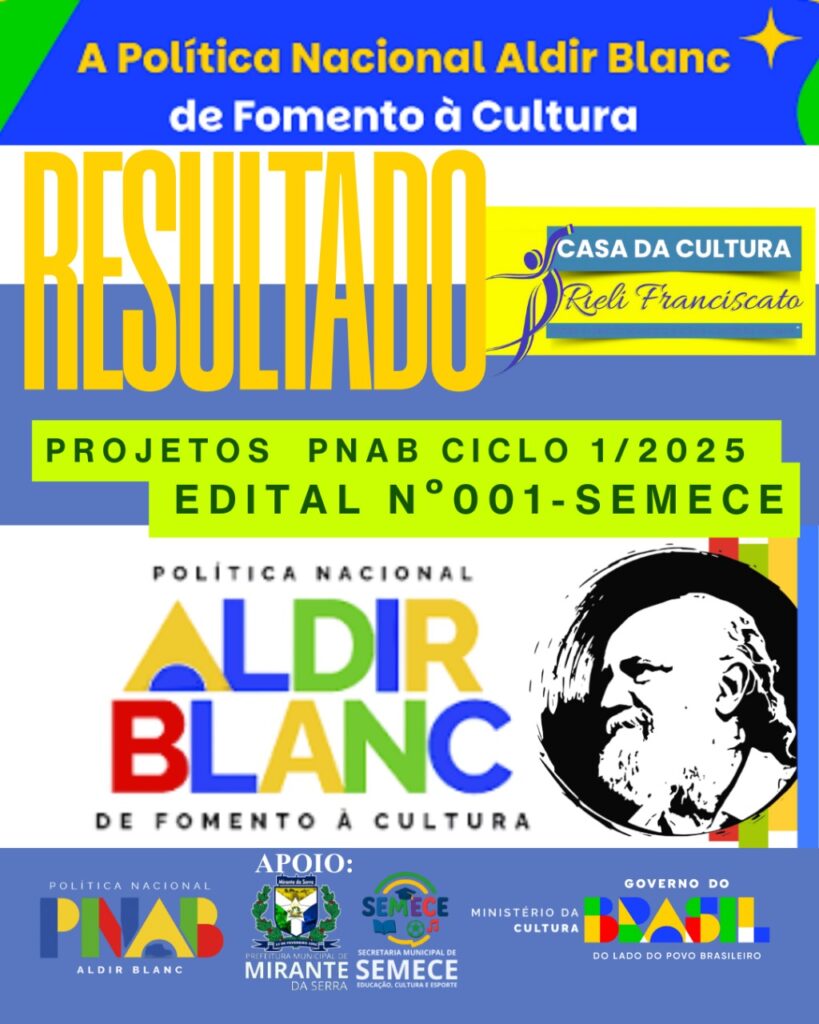 Assim, o valor total repassado pela PNAB, R$ 84.137,46, será redistribuído entre os 13 projetos participantes, de forma proporcional e isonômica, assegurando plena execução dos recursos culturais no município de Mirante da Serra - RO.